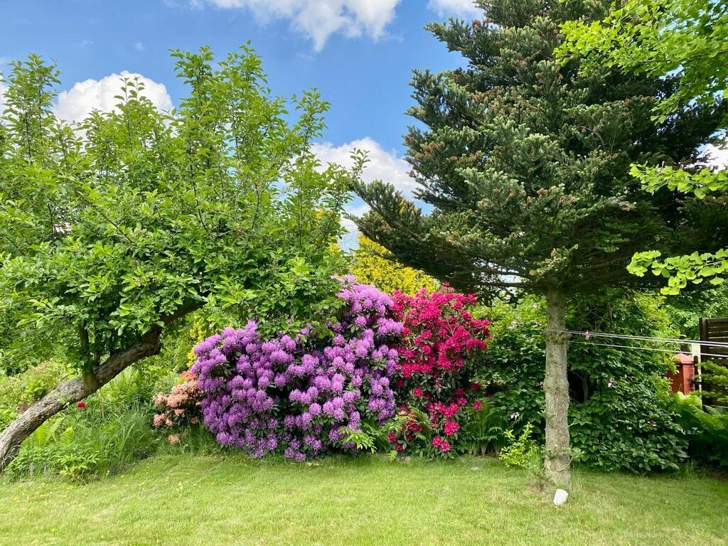 Zadbany ogród z licznymi nasadzeniami i przestrzenią do wypoczynku